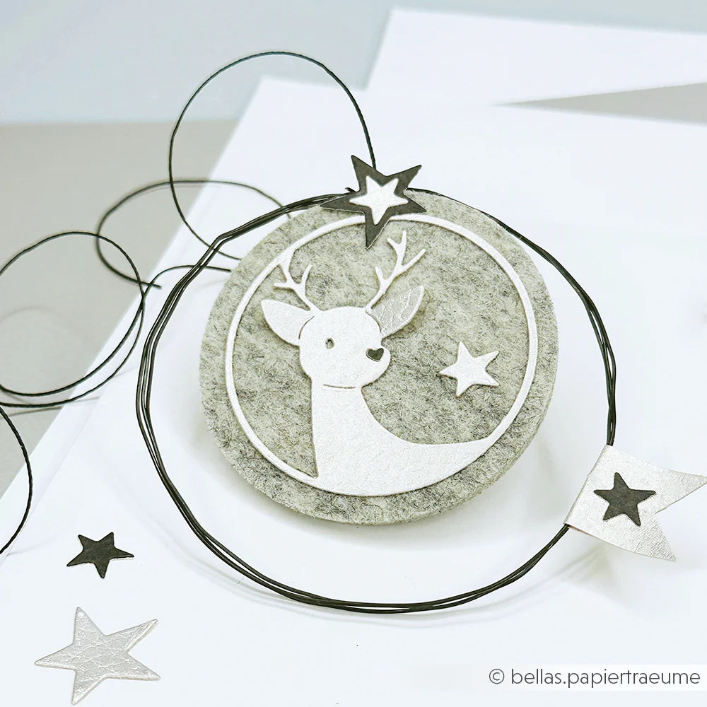 Dies fra Alexandra Renke som passer i de fleste moderne kuttemaskiner med det rette utstyret. Pakken inneholder 2 dies. (Sirkelen med reinsdyr og et bittelite hjerte)