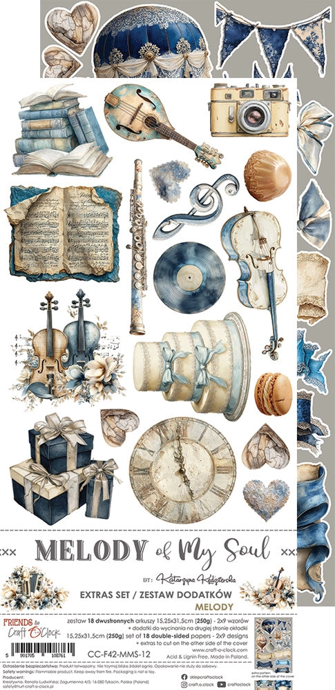 Pakke med dobbeltsidige ark med figurer å klippe ut i serien "Melody of my soul" fra Craft O' Clock.