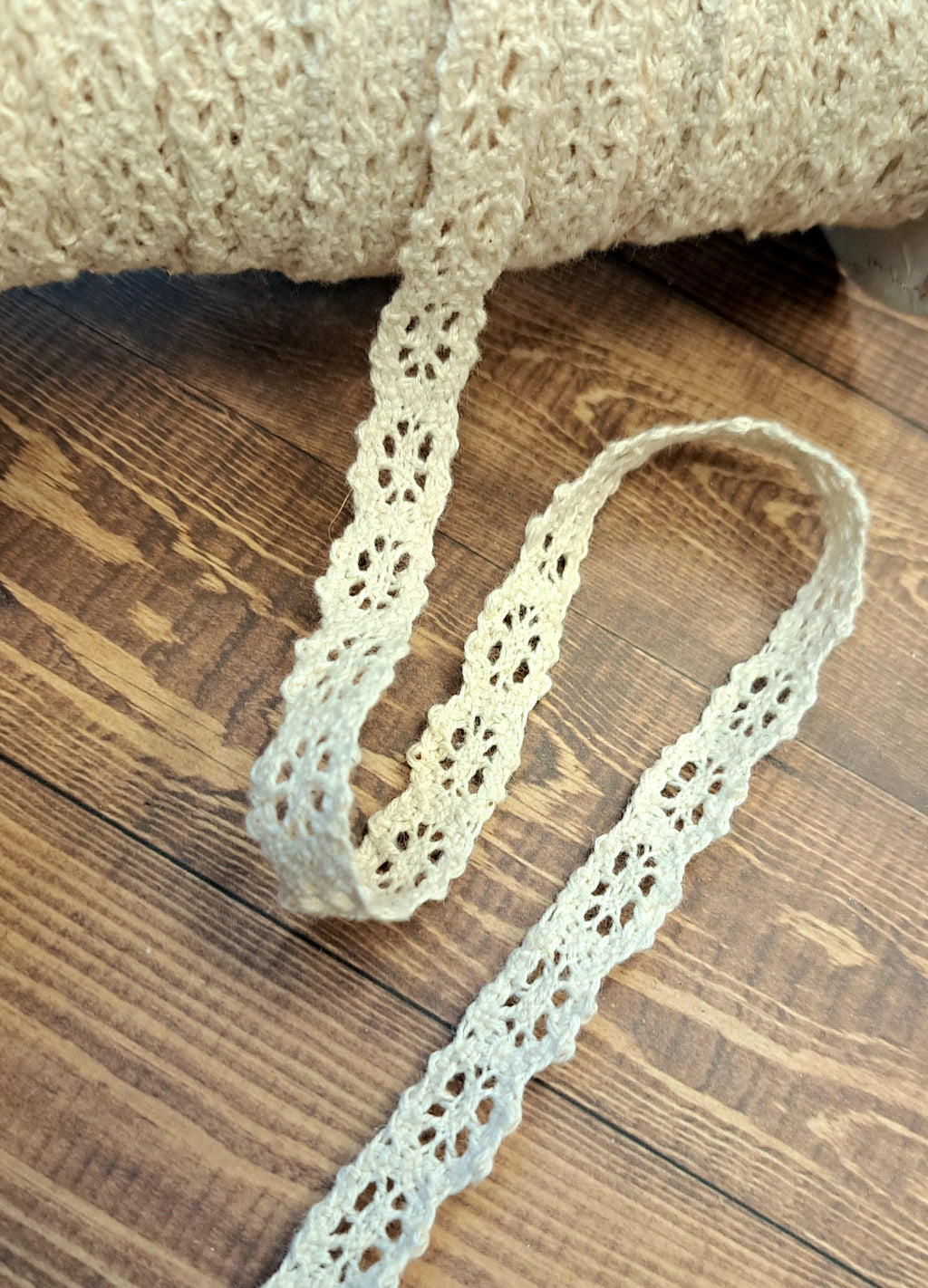 1 meter dekorbånd i kremfarge. Båndet måler ca. 1,2 cm i bredden.