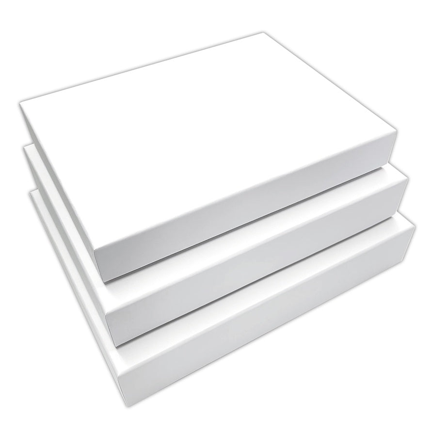 Sett med 3 stk hvite bokser med lokk. Eskene er laget i tykk kartong er kan dekoreres etter ønske med maling, stempling, sprayer osv. Eskene kan brukes som 3 esker eller 6 brett som passer oppi hverandre for organisering og oppbevaring.