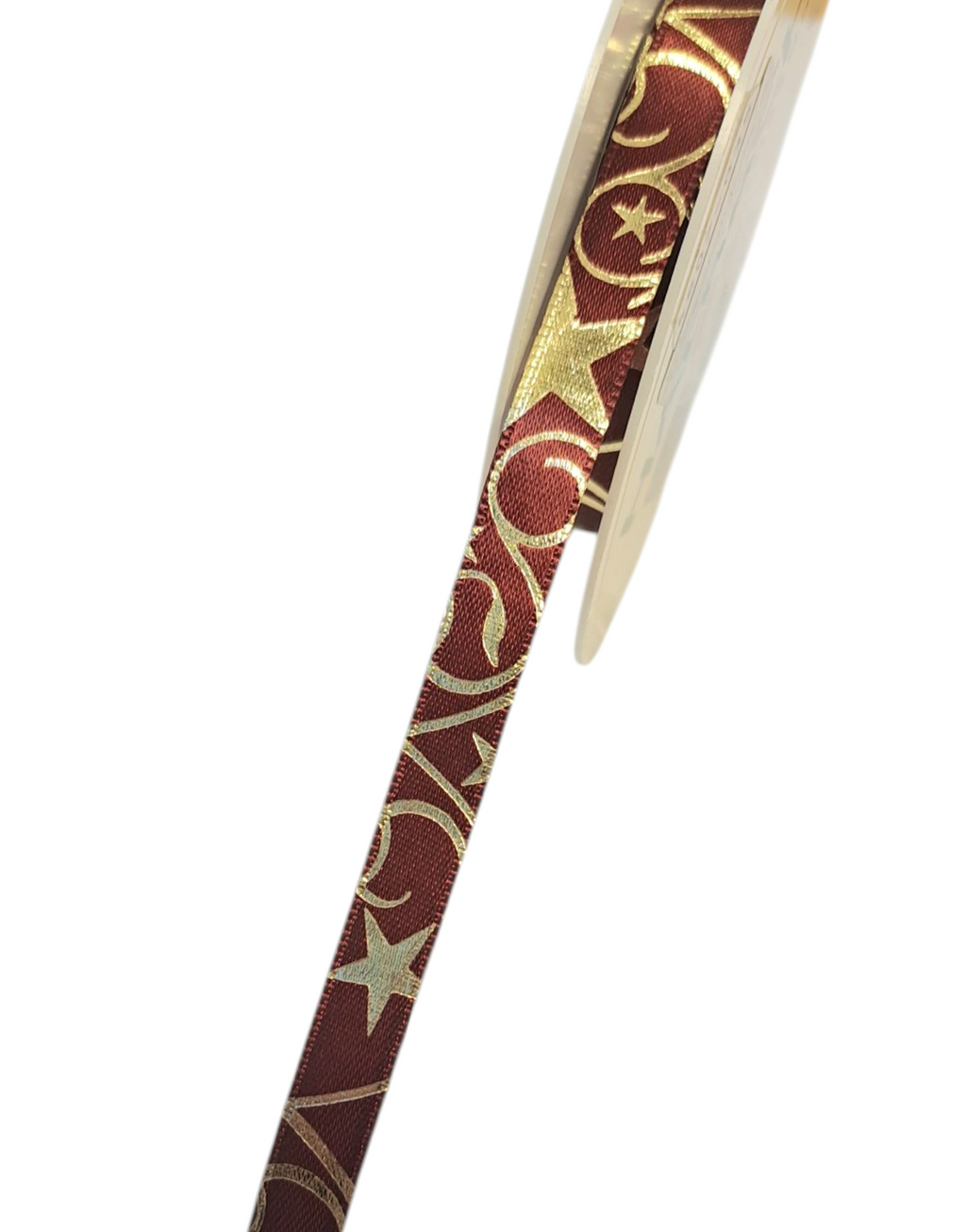 1 meter rødt silkebånd med gullstjerner og gull swirler. Båndet er ca 1 cm i bredde.