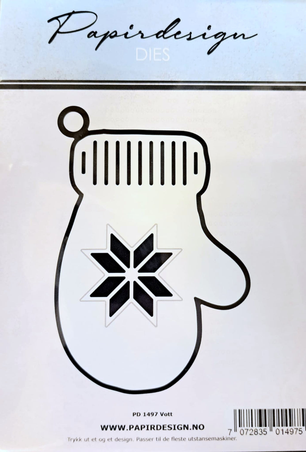 Dies fra Papirdesign. Kan brukes i de fleste moderne kuttemaskiner med det rette utstyret. 2 dies i pakken. Måler med skygge og tag 9,7 cm i høyden og 6,6 på det bredeste ved tommelen - kun vott måler 6,3 x 8,7 cm