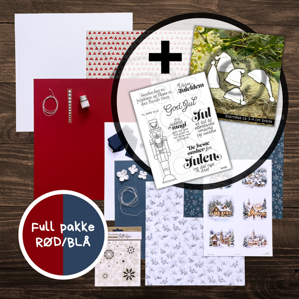 Rødt basic sett inneholder diesen Nisseluer, stempelplate M486, 2 stk 12 x 12" kartong, 1 mønsterark (12 x 12"), chipboard snowflakes, lite glass med distress chunky glitter, samt dekor som tråd og enamel dots.