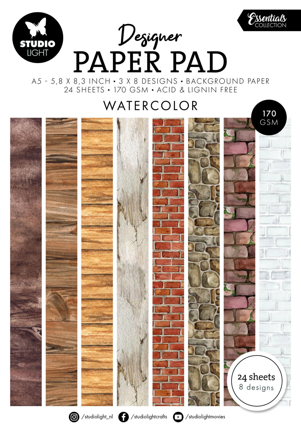 Blokk med 24 stk tosidige mønsterark fra Studiolight. Totalt 8 forskjellige design og 3 av hver.
